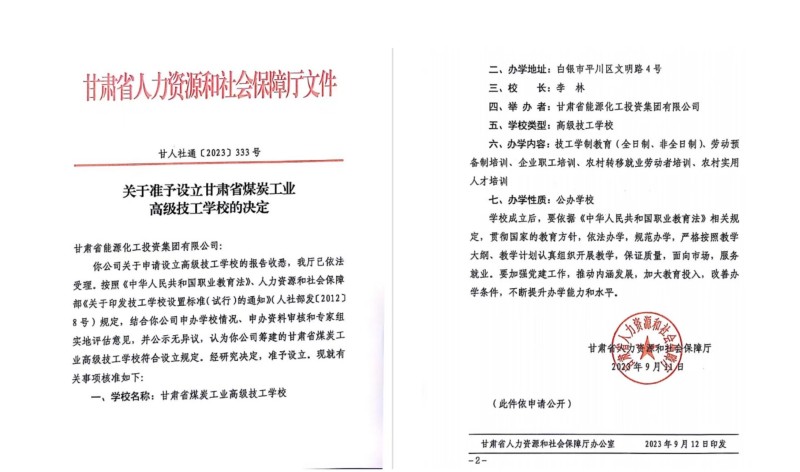 经由前期起劲申报推荐和专家组评估审核,2023年9月12日,甘肃省人力资源和社会包管厅印发了《关于准予设立甘肃省煤炭工业高级技工学校的决议》(甘人社通〔2023〕333号),赞成将甘肃省煤炭工业技工学校升级为甘肃省煤炭工业高级技工学校。标记着甘肃省煤炭工业技工学校在40余年的刷新生长中实现提档升级。