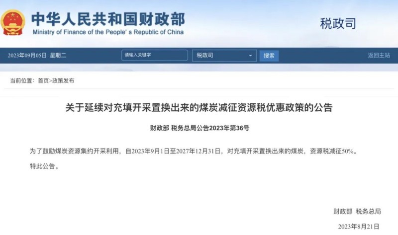 财务部9月4日宣布通告,为了勉励煤炭资源集约开采使用,自2023年9月1日至2027年12月31日,对充填开采置换出来的煤炭,资源税减征50%。