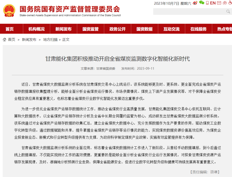 克日,甘肃省煤炭大数据监测剖析系统在甘肃煤炭生意中心上线运行。该系统能够更实时、更系统、更周全完玉成省煤炭产运销存数据填报网络整理剖析,能够周全剖析全省煤炭运行情形、市场供需情形、煤炭上下游工业生长情形等,关于包管全省煤炭清静稳固供应具有主要意义,也标记着全省煤炭行业数字化智能化生长迈出主要程序。
