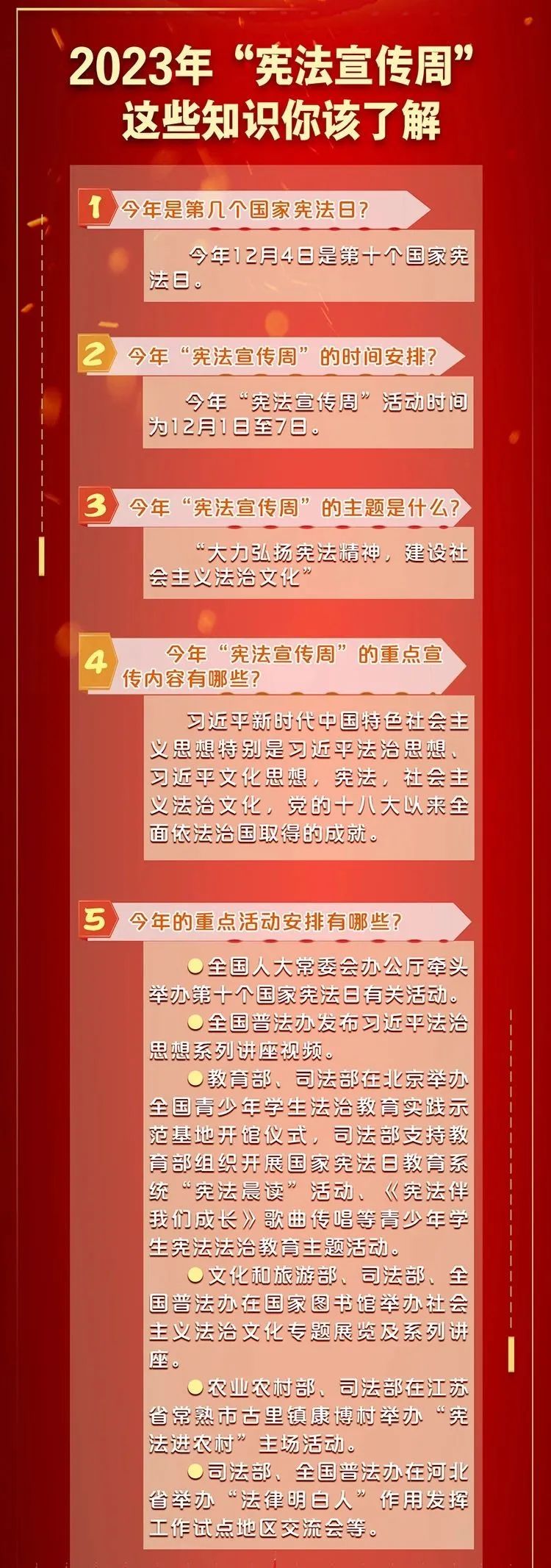今年12月4日是第十个国家宪法日。日前,中央宣传部、司法部、天下普法办团结印发通知,于12月1日至7日在天下开展2023年“宪法宣传周”活动,主题为“鼎力大举弘扬宪法精神,建设社会主义法治文化”。